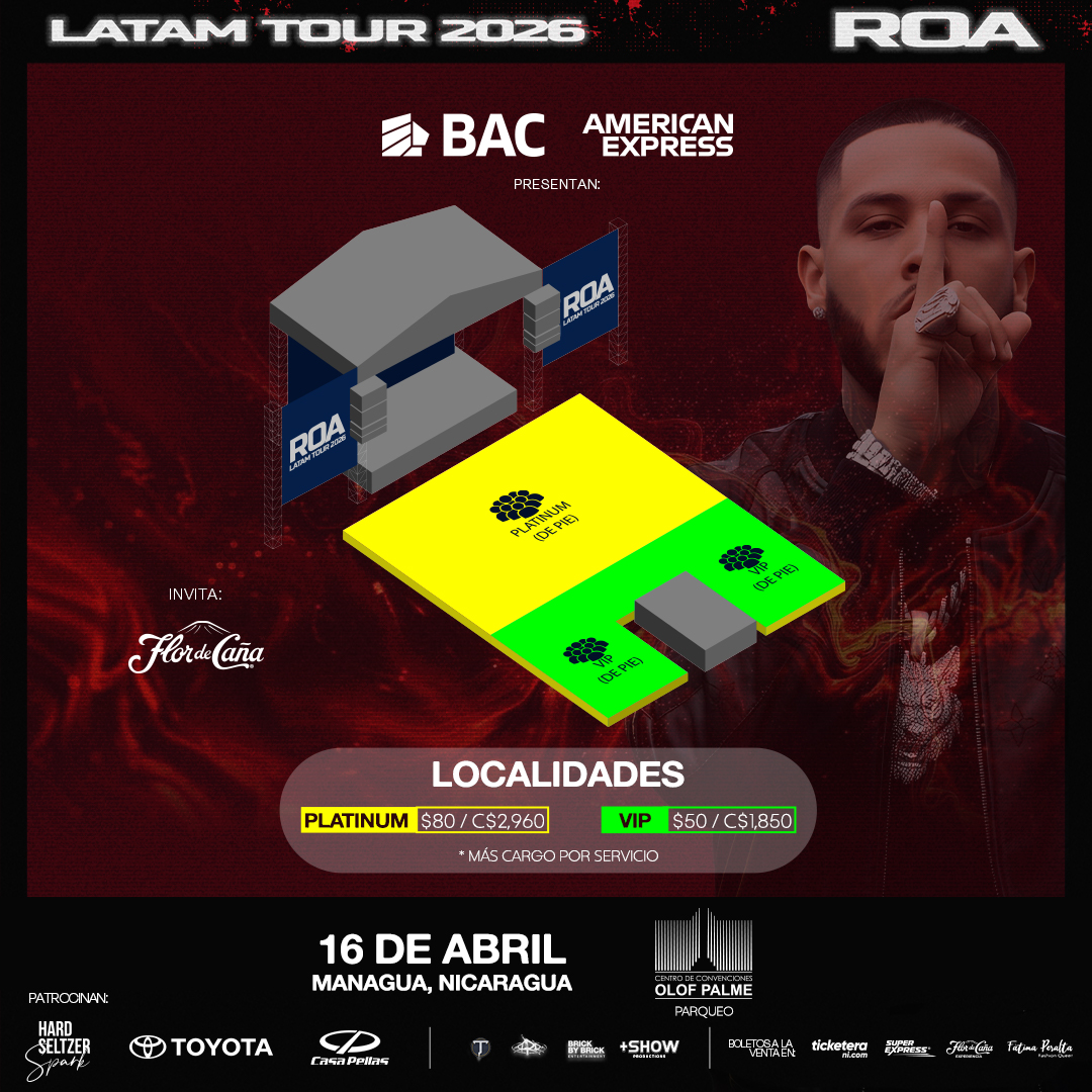 ¡Ya inició la Preventa Exclusiva para tarjetas American Express de Nicaragua (AMEX)! Desde el 28 de febrero hasta el 02 de marzo, puedes asegurar tus entradas antes que nadie y disfrutar de un 10% de descuento automático, el cual se verá reflejado directamente al seleccionar Banco AMEX como tu método de pago en la pantalla de facturación.
